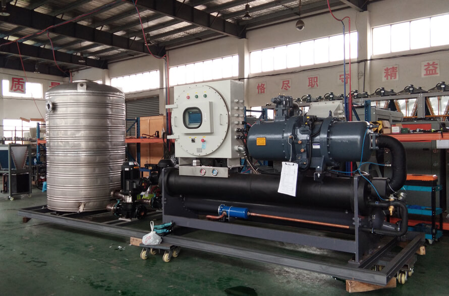 1、中溫一體式防爆螺桿低溫機(jī)組:出水溫度-5℃~-40℃,采用進(jìn)口半封閉螺桿壓縮機(jī)組(帶經(jīng)濟(jì)器);可提供-5℃~-45℃低溫乙二醇溶液或鹽水溶液;