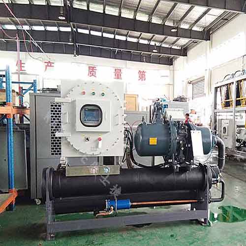 制藥業(yè)控溫用乙二醇螺桿式防爆冷水機(jī)組是以螺桿式壓縮機(jī)提供動(dòng)力的低溫控溫設(shè)備,用于易燃易爆場(chǎng)所。